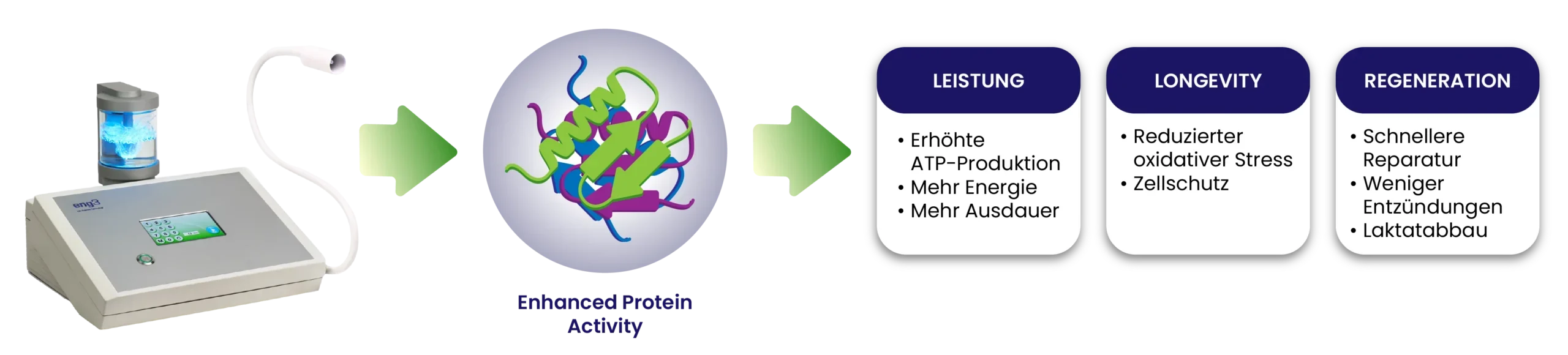 Durch die Reduzierung von Proteinschäden erlangen Zellen ihre volle Reparatur- und Regenerationsfähigkeit zurück. Wiederhergestellte Proteine reparieren Schäden die oxidativer Stress verusachte, steigern die mitochondriale ATP-Produktion, verbessern die Entgiftung und erhöhen die Verwertung von Sauerstoff, Nährstoffen und anderen aufgenommenen Substanzen. Letztendlich verbessern wiederhergestellte Protein