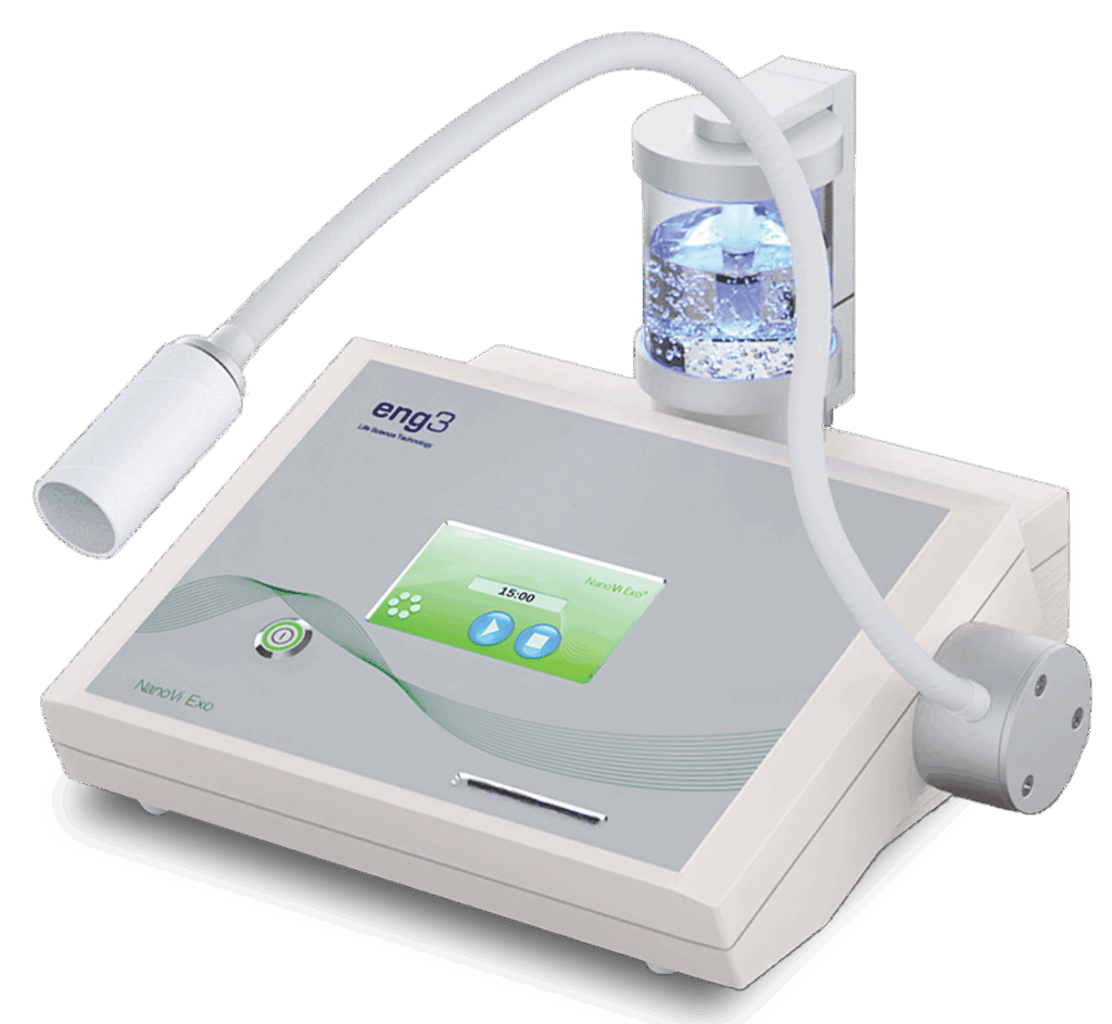 Befeuchter montieren und einsetzen: Schrauben Sie den Befeuchteraufsatz auf den Glasbehälter und setzen Sie die Einheit anschließend oben in das NanoVi-Gerät ein. Achten Sie dabei auf den korrekten Sitz des beiden Röhrchen.