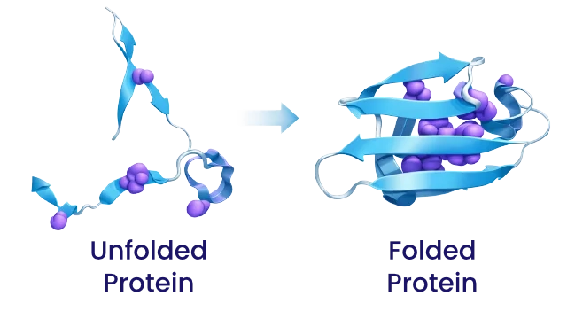 Protein folding is a thermodynamic process controlled by a change in entropy between the protein and the thin layer of ordered water surrounding it. Functional proteins are formed when an unfolded amino acid chain transitions from a state of low order (high entropy) to a state of high order (low entropy).