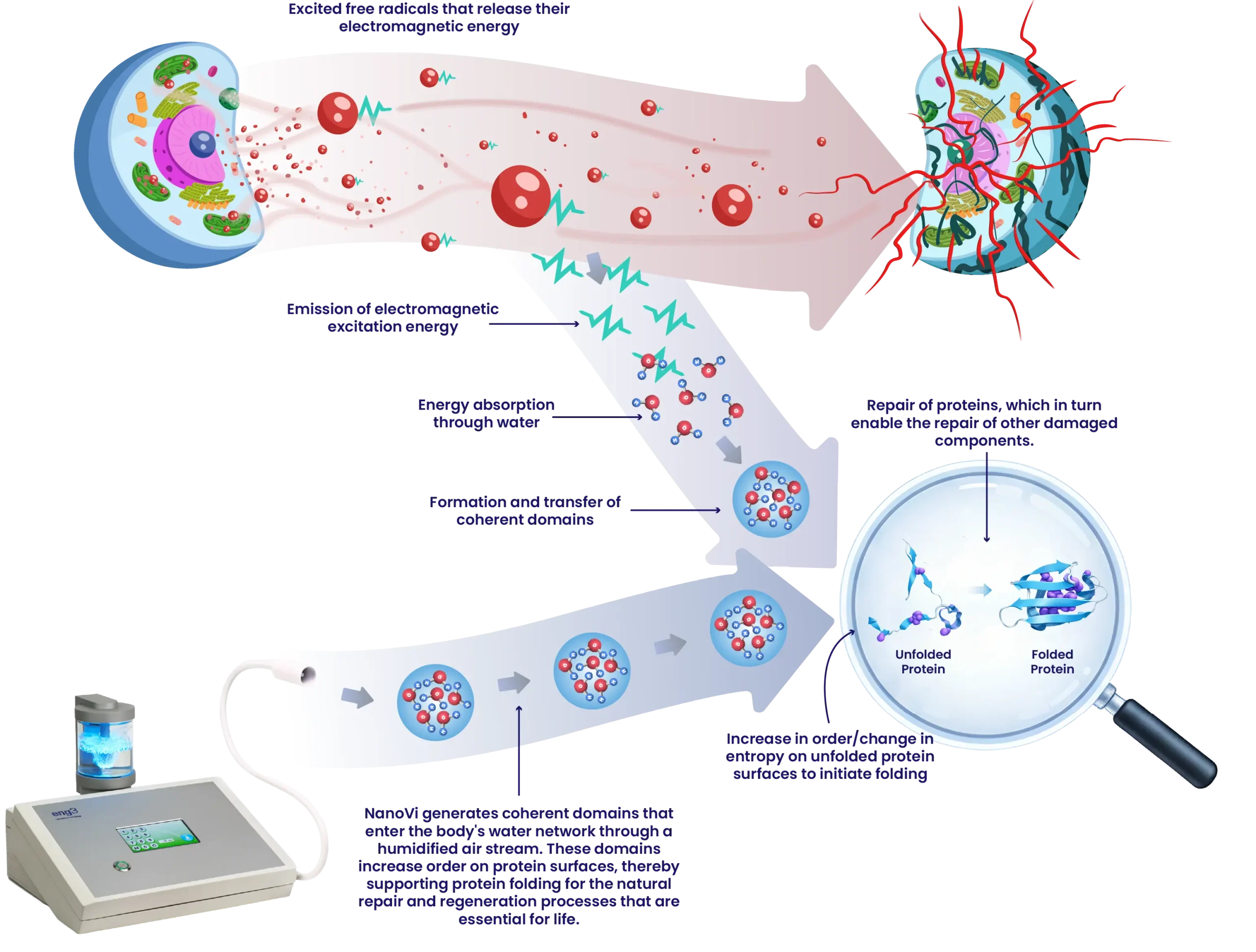 In cell biology, the properties of water—energy absorption, the formation of coherent domains, and surface order—are fundamental to protein folding. The process begins with the release of specific, absorbable electromagnetic energy by excited free radicals. This energy is absorbed by the surrounding water molecules and forms coherent domains, which create a thin layer of more highly ordered water molecules on the surface of unfolded proteins. Subsequently, the entropy exchange crucial for protein folding takes place. Unfolded proteins exist in a disordered state (high entropy). To fold into a more ordered protein, the unfolded protein must transition to an ordered state (low entropy). The water relinquishes its order, the proteins gain order, fold, and become structured and functional.