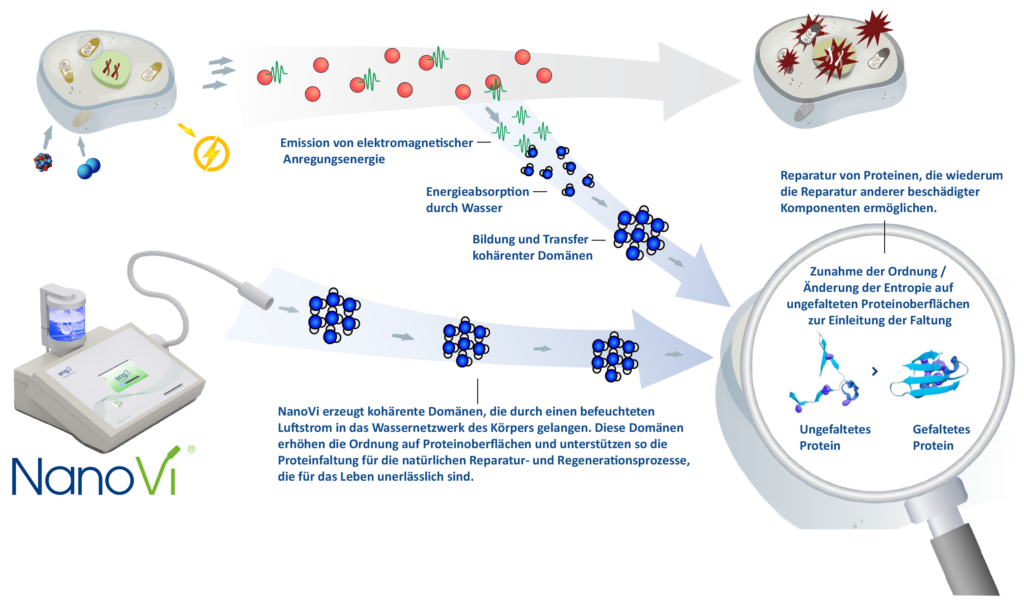 Die patentierte NanoVi®-Technologie emittiert wasserabsorbierbare elektromagnetische Energien – darunter auch die, die von freien Radikalen freigesetzt werden –, um kohärente Domänen zu erzeugen und zu übertragen. Zur Übertragung dieser Domänen sind Wassermoleküle mit geringem Abstand notwendig. Dazu verwendet das NanoVi®-Gerät einen befeuchteten Luftstrom um diese Domänen an die Schleimhäute zu leiten, die sich dann im gesamten Körperwasser verteilen.